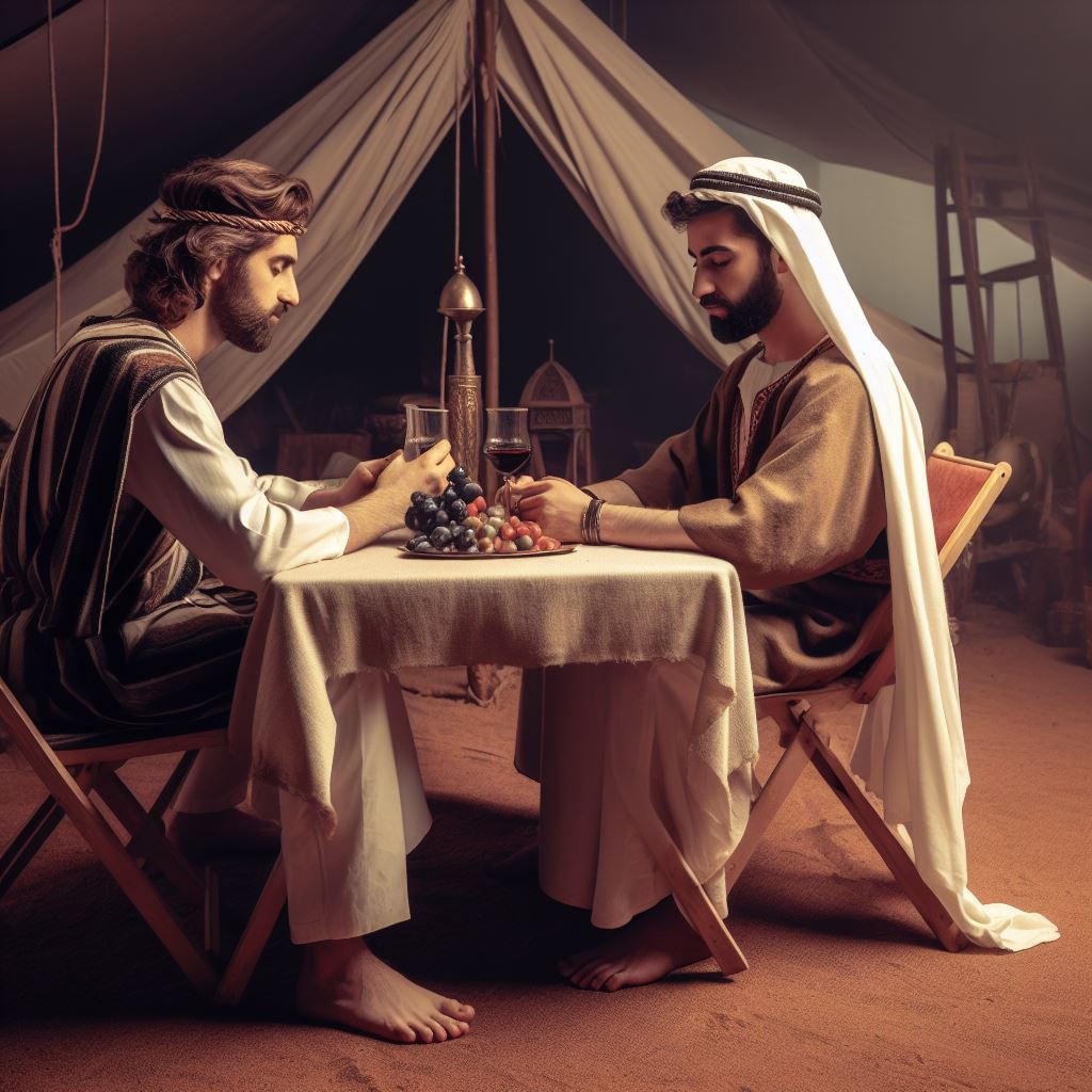 Let us fill the gaps in the imagery to get a fuller picture. With enemies in hot pursuit of his life, a helpless person runs into the house of a person who receives him gladly. He provides him with food and shelter from his enemies. When the pursuers arrive, the man sits with his host, feasting at the table. Finding their victim feasting and secure, the enemies must have given up their pursuit.